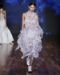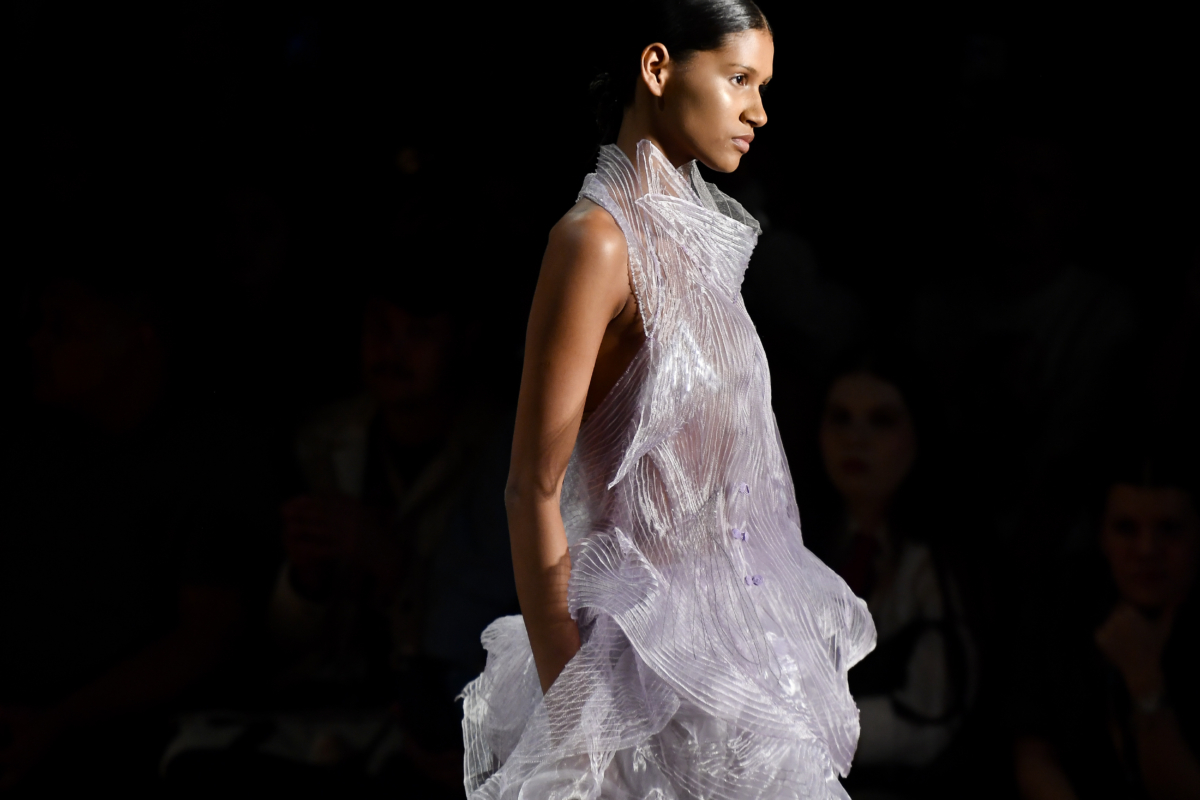 Sua moda costuma ser multicolorida, e os tons florestais de marrom, verde e roxo apareceram também, nos vestidos fluidos das mulheres-ninfas. As peças esculturais ganharam nessa estação bordados de tecidos, como um mosaico colorido sobre o vestido de Carmelita.